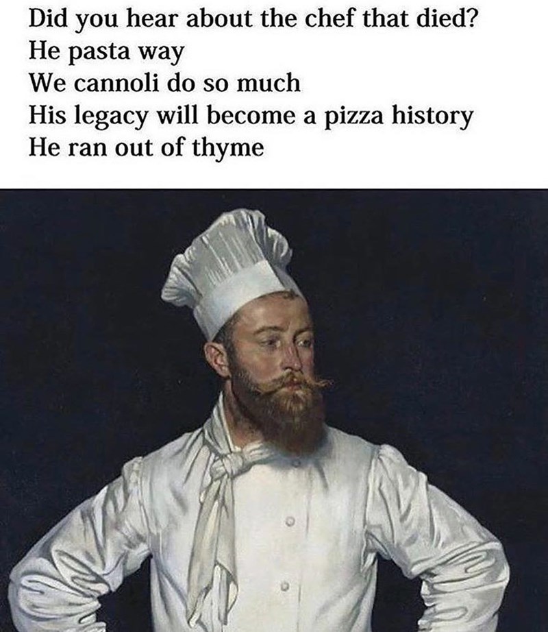 Trending images and videos related to chef! I subscribed idubbbz around like march (my first idubbbz video was the samurai buyer) so what does the meme actually mean and what's the origin of it? The italian chef kiss refers to a stereotypical gesture made by cooks of european descent that indicates perfection or deliciousness. Ho cercato di rieditarlo per renderlo ancora più. « la colatura est un produit très fort mais le résultat d'une fermentation très noble, je n'ai jamais trouvé la même finesse ailleurs, c'est très élégant. Create meme pizza dodo pizzamaker italian chef pizza. Okay, fair cop, it is a bit of an exaggeration, perhaps, but sometimes it feels this way, doesn't it? High quality italian chef gifts and merchandise. If you like chef humor, you might love these ideas. See more ideas about chef, memes, chef life. At memesmonkey.com find thousands of memes categorized into thousands of categories. Our pastry/baking class received a chef knife, serrated knife and a paring knife. 28 hilarious memes that'll make chefs cry laughing.